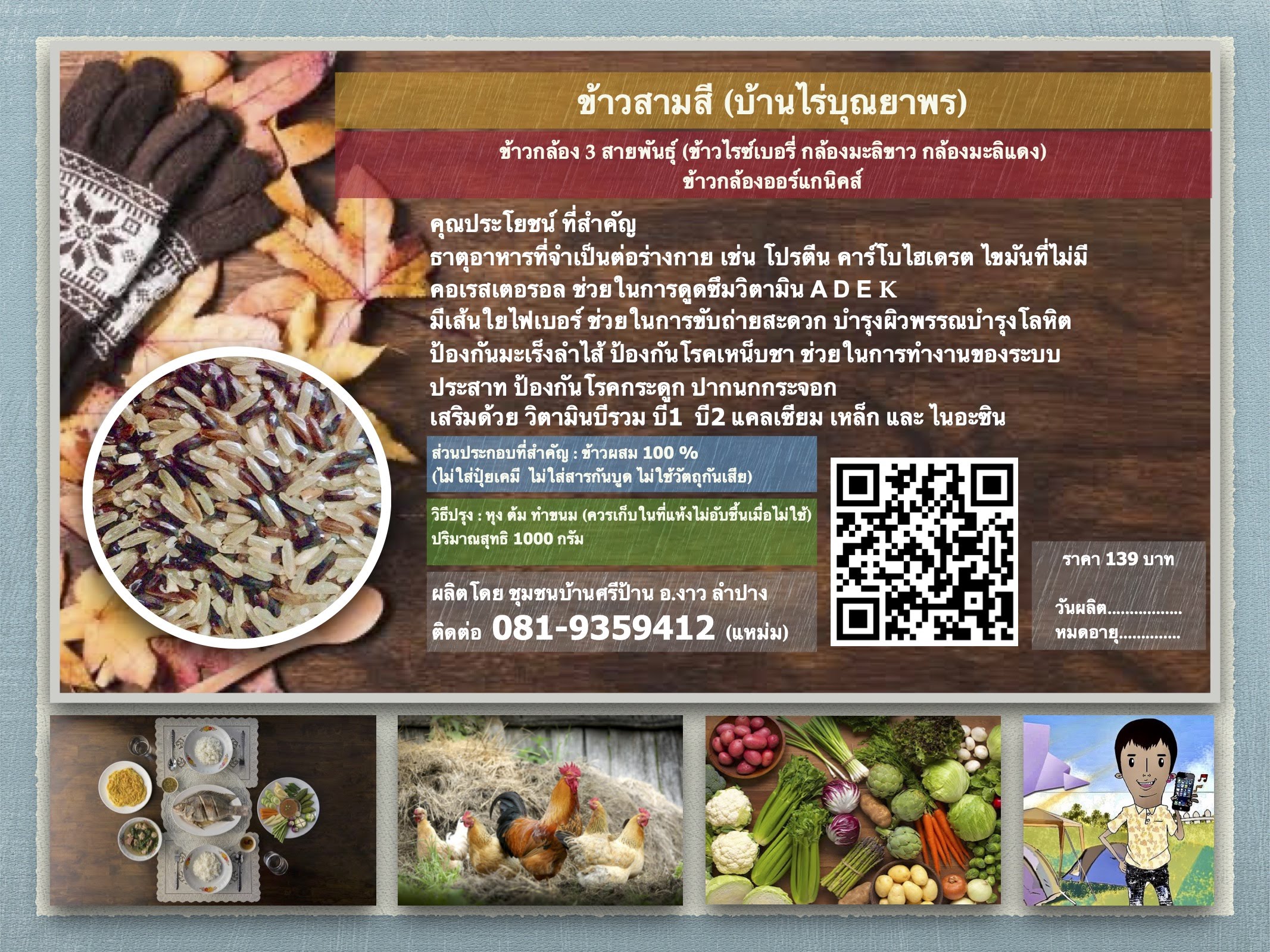 การนำข้าวกล้องหอมมะลิ ,ข้าวกล้องหอมมะลินิล ,ข้าวกล้องหอมมะลิแดง มาบรรจุในถุงเดียวกันเพื่อให้หุงผสมและรับประทานทั้ง 3 ชนิดพร้อมกัน เพื่อเกิดคุณประโยชน์สูงสุด